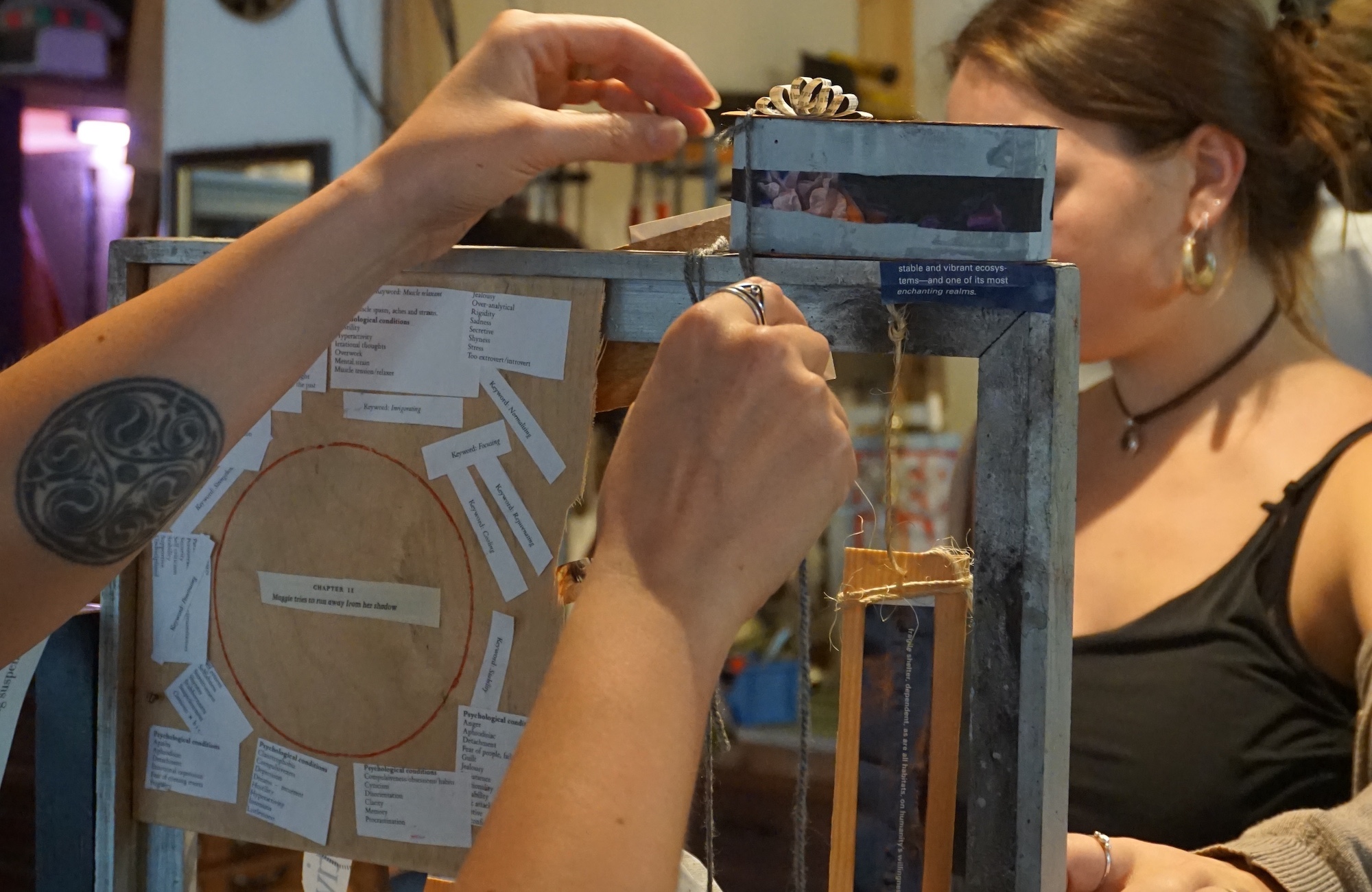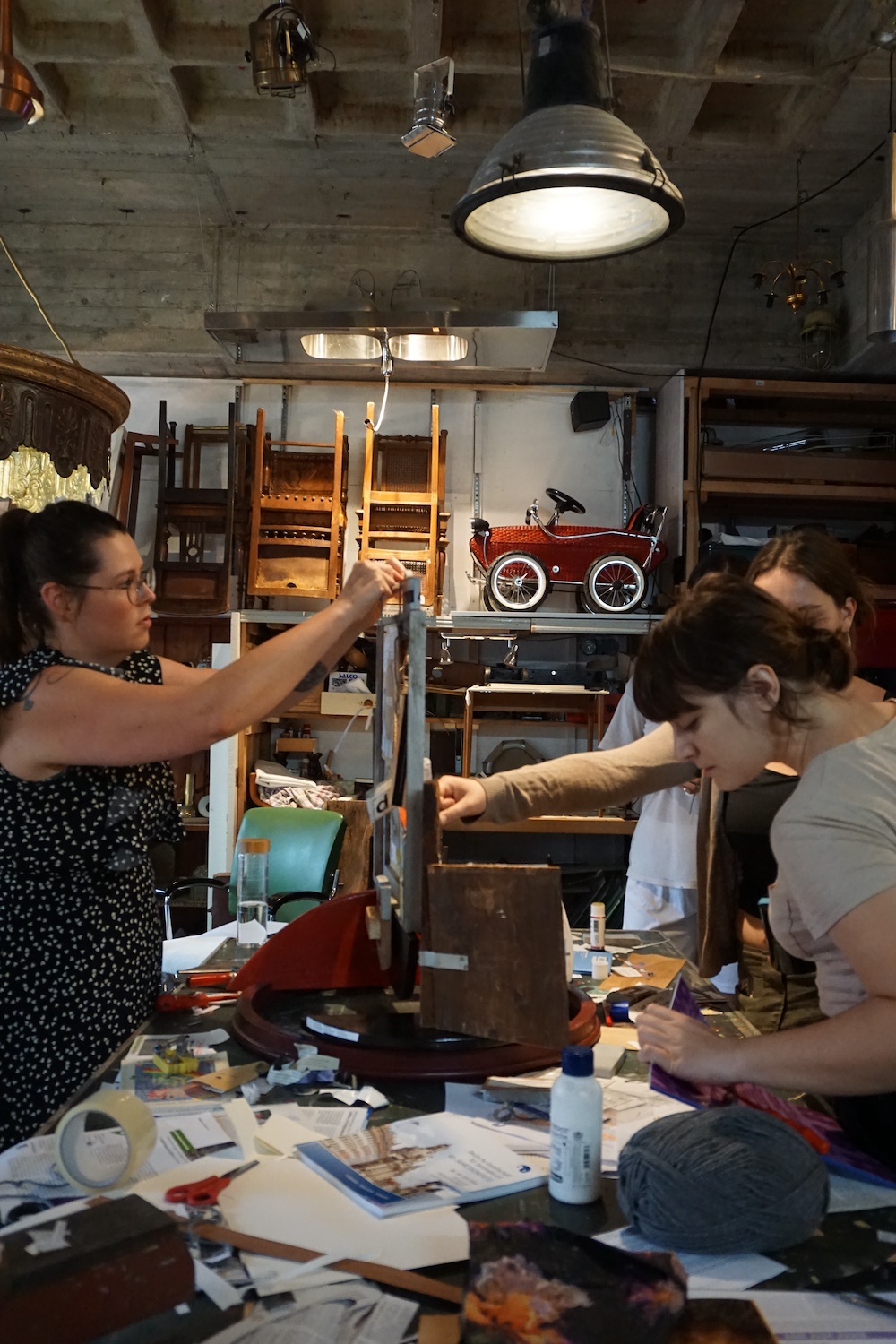 Poet’s Corner and Cie 209 invited Katarina Gotic to lead a workshop at Upcycling. Together, we upcycled old texts and created a textual sculpture. We copied, cut, wrote, rewrote, painted, glued, drilled, and somehow made it all work—using materials found that day. We explored, experimented, and discussed what upcycling means for both the world and for poetry. The result was presented to the public at Silent Green Kulturquartier as part of the Poesie Festival (Haus für Poesie).