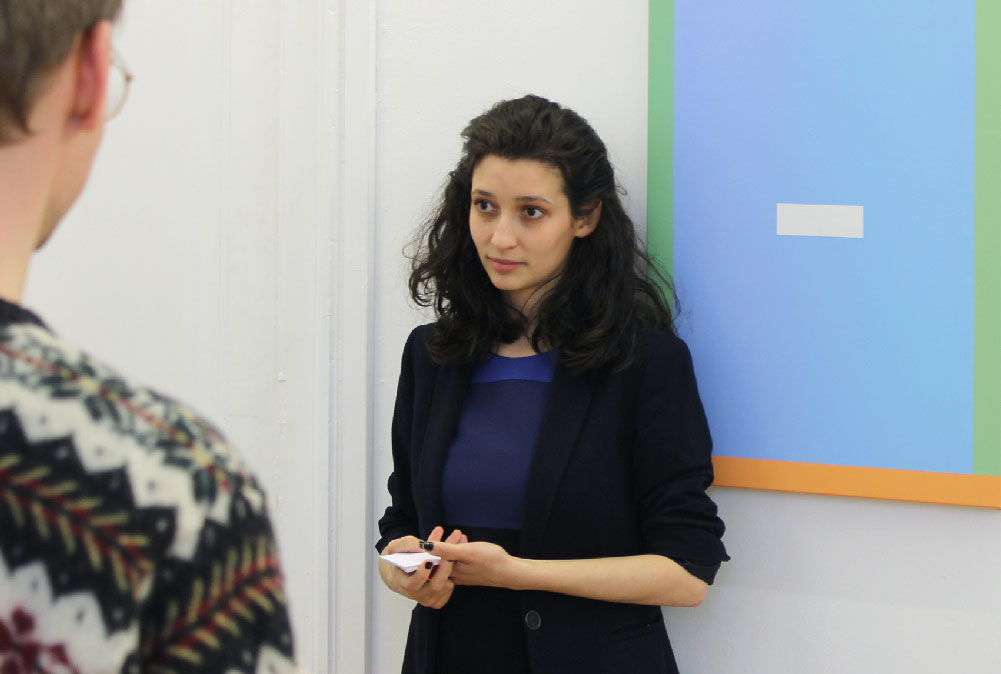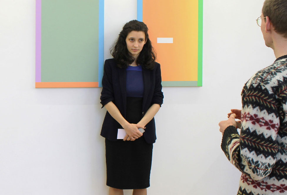 The exhibition —Sarah Bal— featured fourteen paintings and two video lectures that were linked by three elements: the fictional persona of Sarah Bal, an artist fascinated by colour, played by me; excerpts from music by C.P.E. Bach and Franz Liszt, played by pianist Lucas Blondeel; and the figure of the dash, here used to build bridges between politics and art, the serious and the playful, reality and fiction. The painter Sarah Bal gave guided tours for the exhibition's finissage.